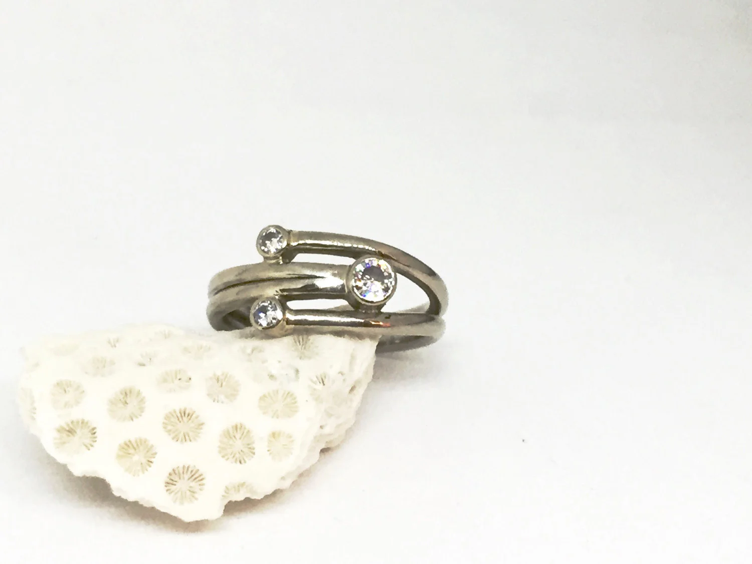 this eclectic style ring is made with 14kt white gold palladium round wire (14 gauge) band. the band is made up of two round wires side by side that are forged to become one wire on the other end.. the band will split on one side of the ring for the 2-2mm moissanite stones, and the other side will have a 3mm moissanite stone just as pictured. polished or matte surface available.....pictures show polished surface. also, available in 18k yellow gold. please inquire for price.