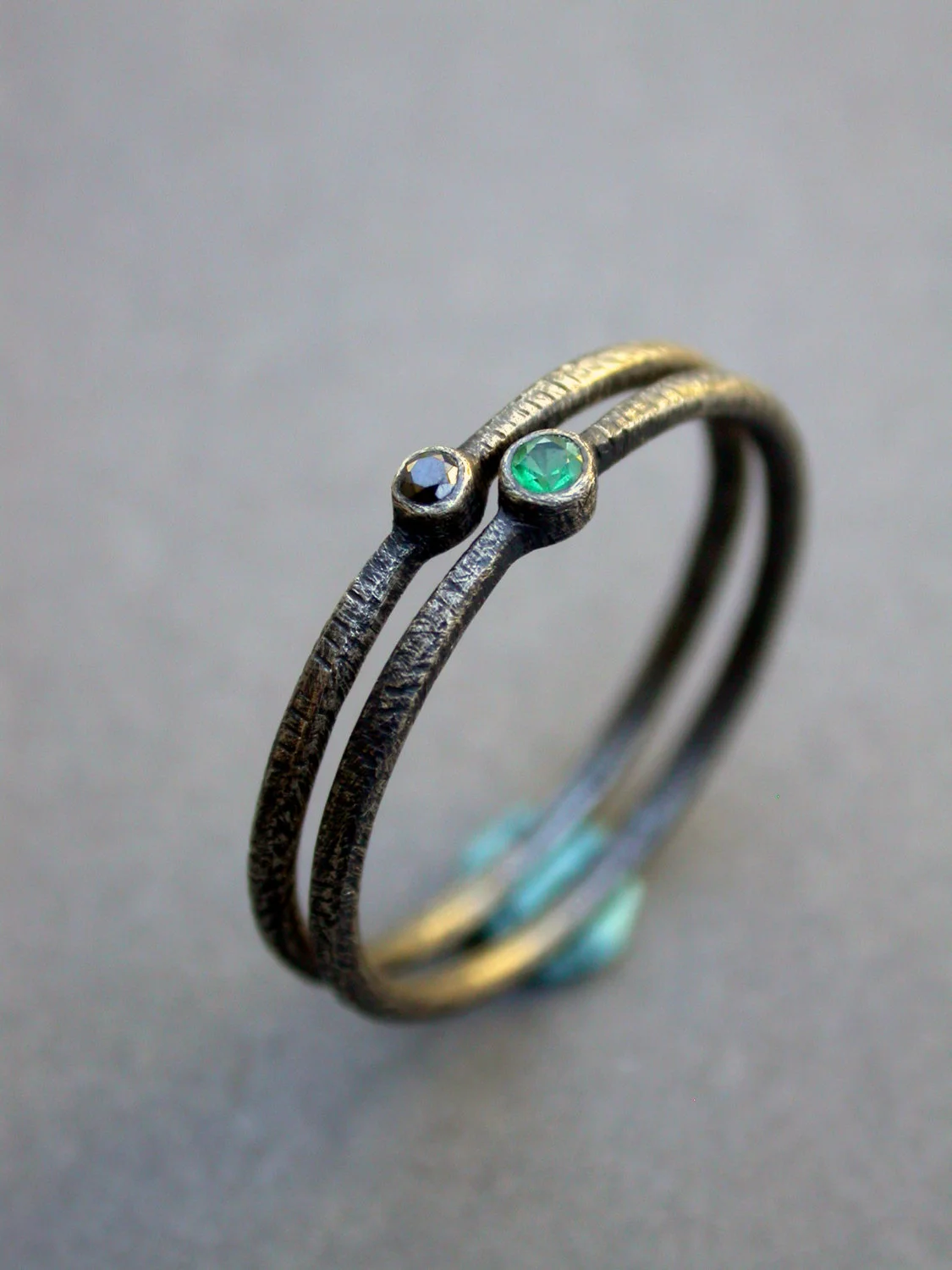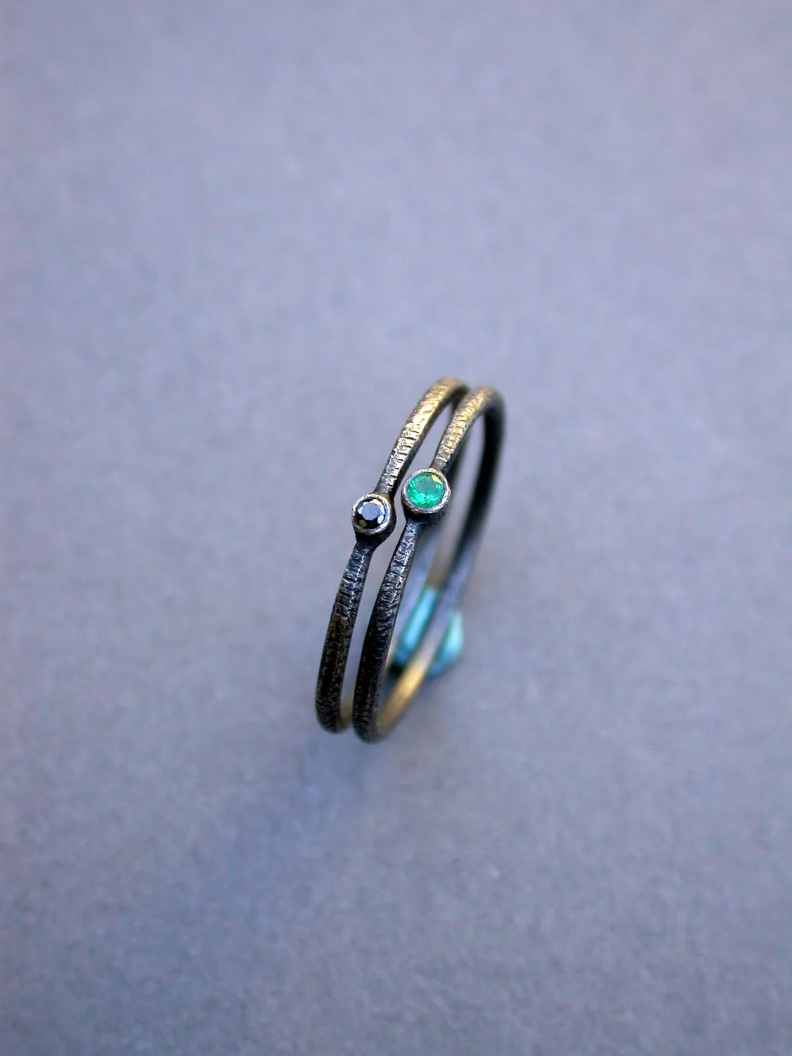 each band is made with 16 gauge sterling silver wire and a simple setting with one black diamond (1.5mm) and one emerald (2mm). the bands are tapered towards the diamond for a sweet and feminine aesthetic. the rings are finished with texture and oxidation to add a little edge. the oxidation wears with time. diamonds used are ethically sourced.