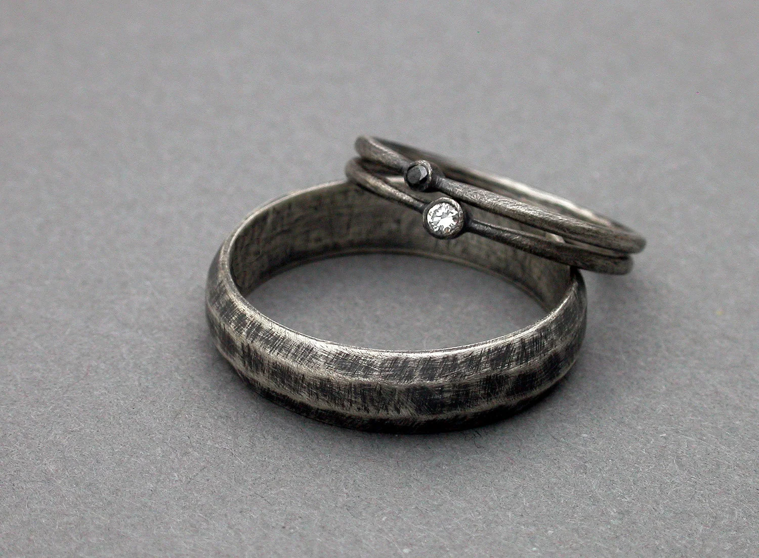 **the metal for these rings is oxidized sterling silver. the oxidation will wear with time, become burnished over time, and the oxidation will lessen. this is the evolution of oxidized sterling. it will take on it's own natural surface as time goes by and the rings are worn regularly. this can be faster process for some people depending on body chemistry. if you do not enjoy the process of how oxidized sterling wears over time please do not order this ring in oxidized sterling**