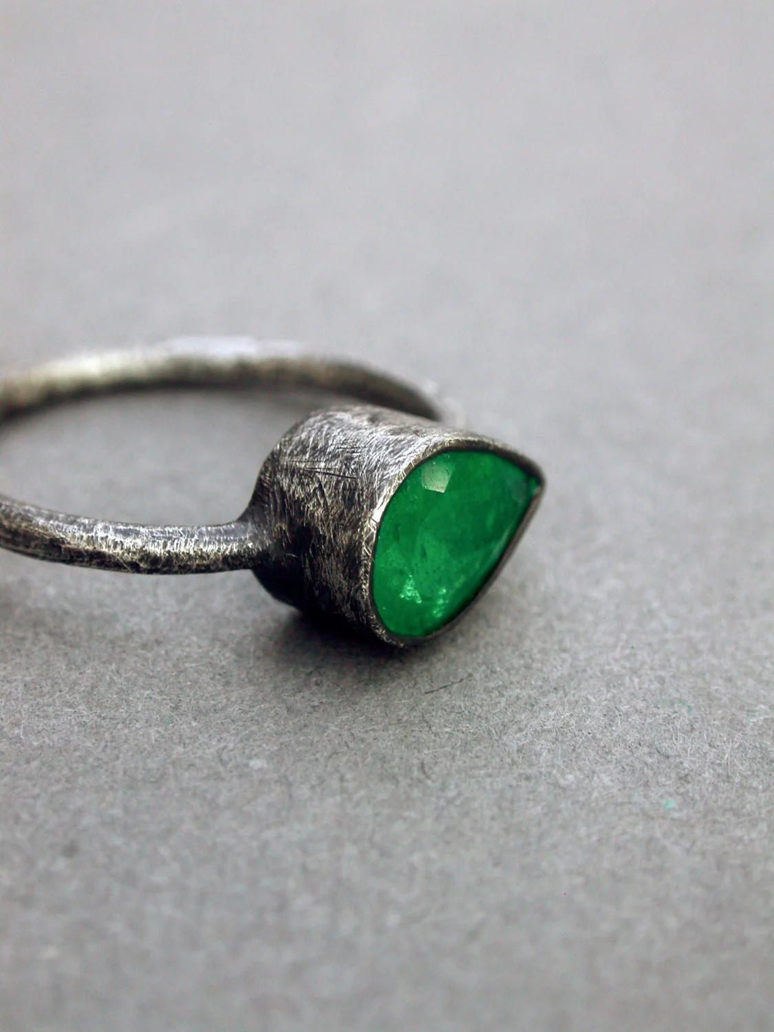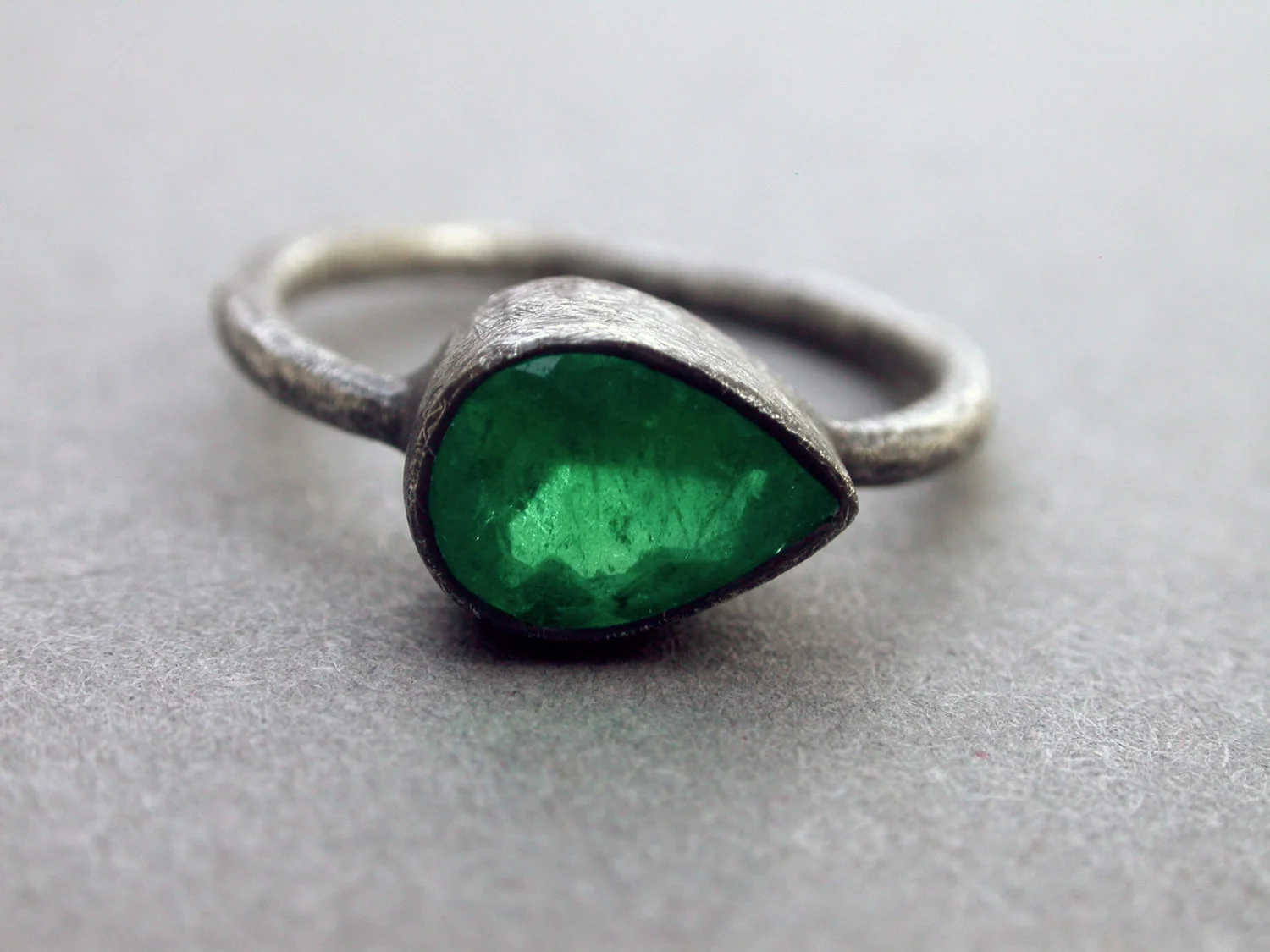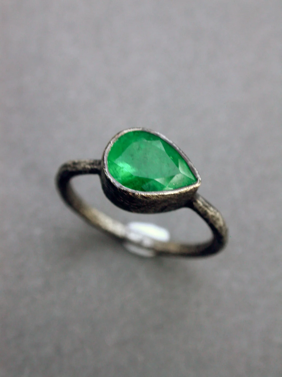 wonderful emerald engagement ring in oxidized sterling. this emerald is a 6mm x 8mm all natural faceted gemstone from colombia. this ring is made to order with a teardrop shaped stone of your choice. tell me the stone or color of stone you would like and i will make a custom ring for you: emerald, ruby, garnet, sapphire, opal, aquamarine, labradorite....or if you have a favorite stone in mind give me a shout.
