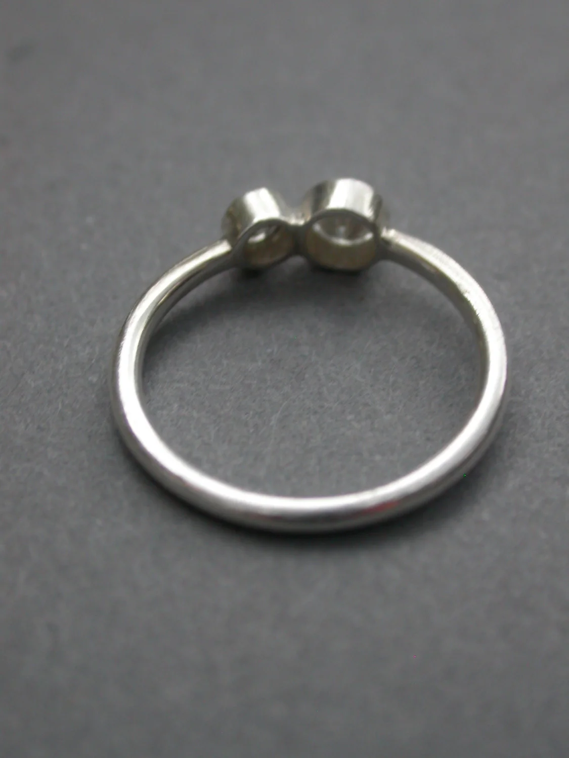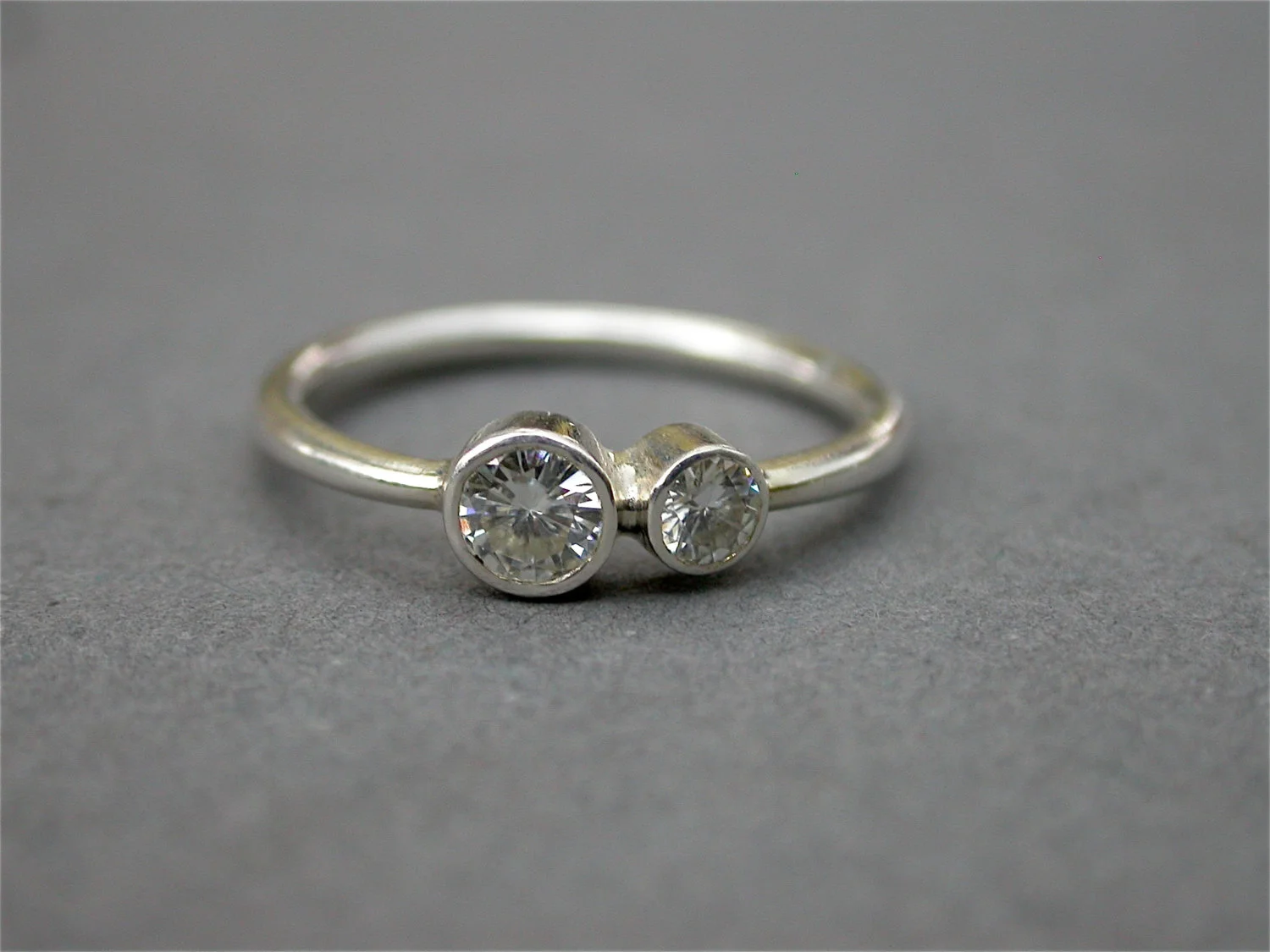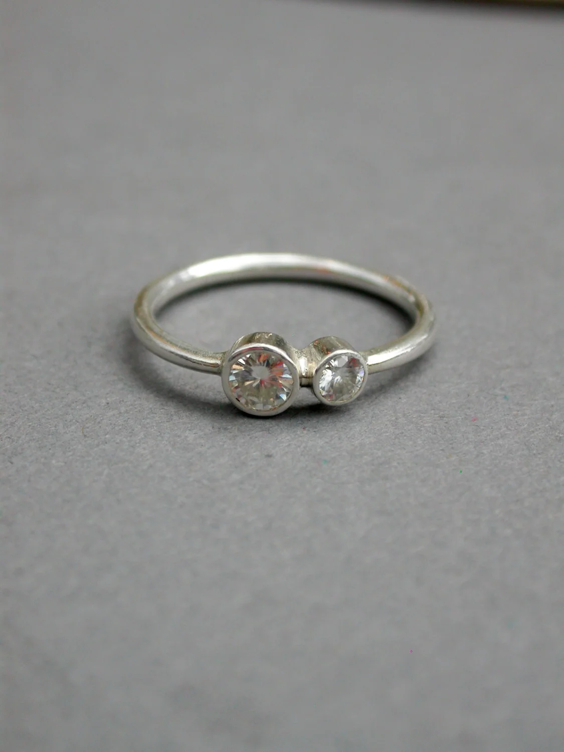 this ring is a nod to my love of asymmetry: made to order with two moissanite stones, one 3mm and one 4mm stone. the metal is polished sterling silver. the band is made with 14 gauge wire.