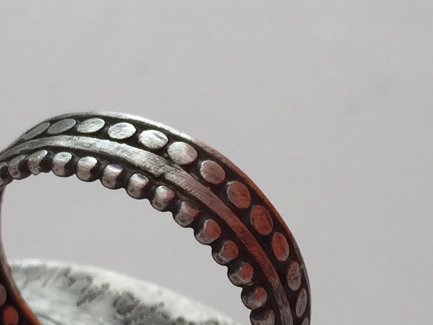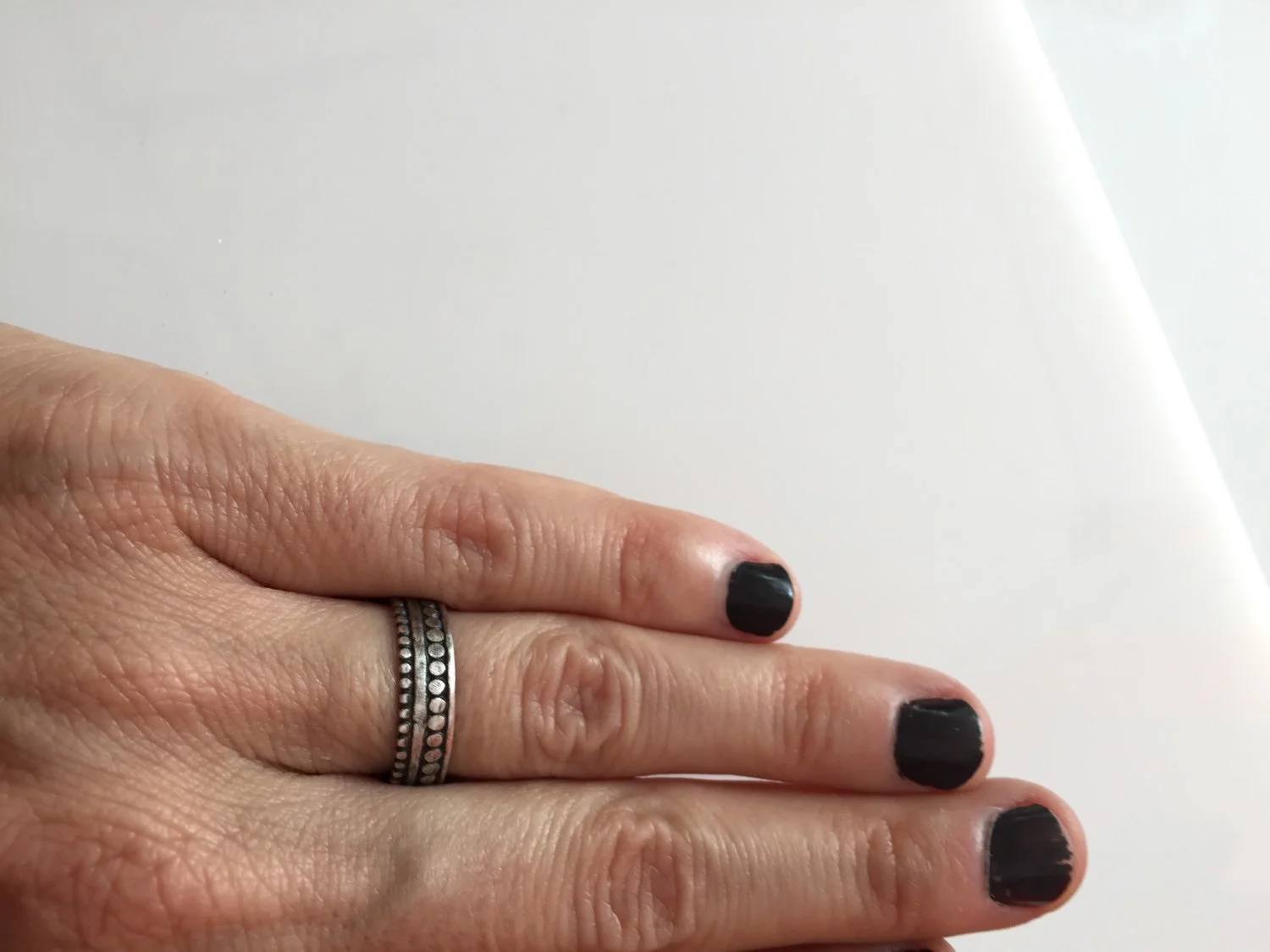 **the metal for these rings is oxidized sterling silver. the oxidation will wear with time, become burnished over time, and the oxidation will lessen. this is the evolution of oxidized sterling. it will take on it's own natural surface as time goes by and the rings are worn regularly. this can be faster process for some people depending on body chemistry. if you do not enjoy the process of how oxidized sterling wears over time please do not order this ring in oxidized sterling**